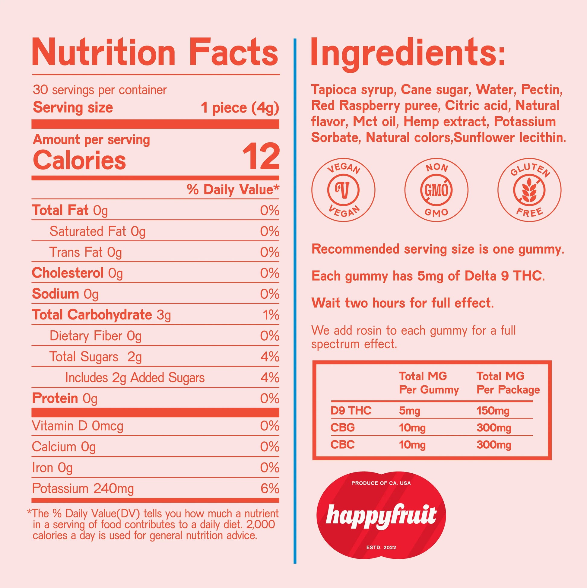 Tapioca Syrup, Cane Sugar, Water, Pectin, Fruit Puree, Citric Acid, Natural Flavor, MCT Oil, Hemp Extract, Potassium Sorbate, Natural Colors, Sunflower Lecithin